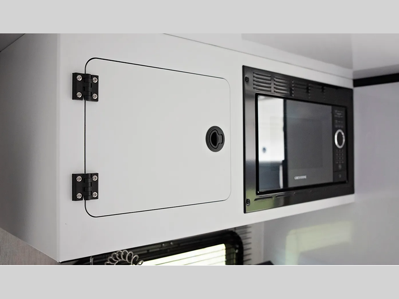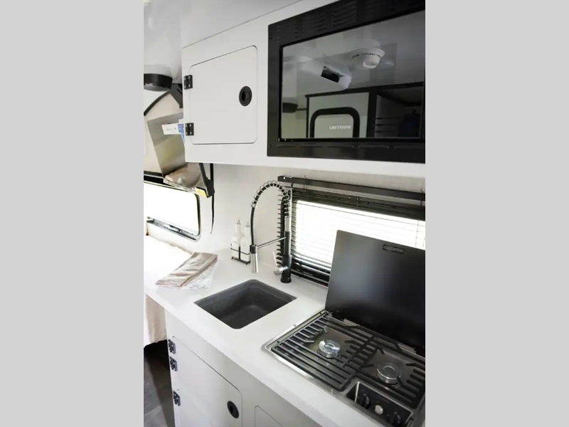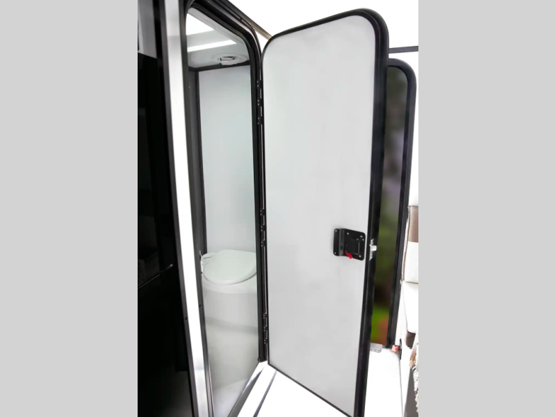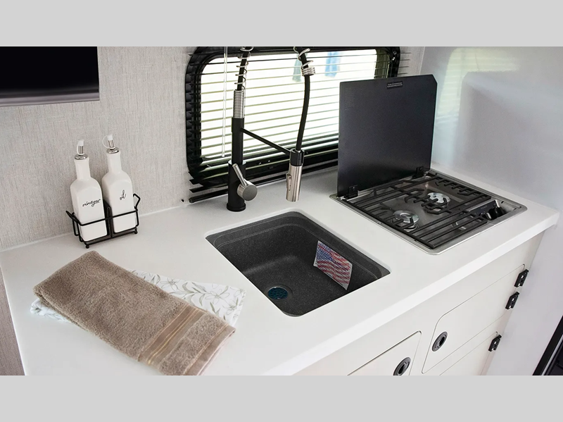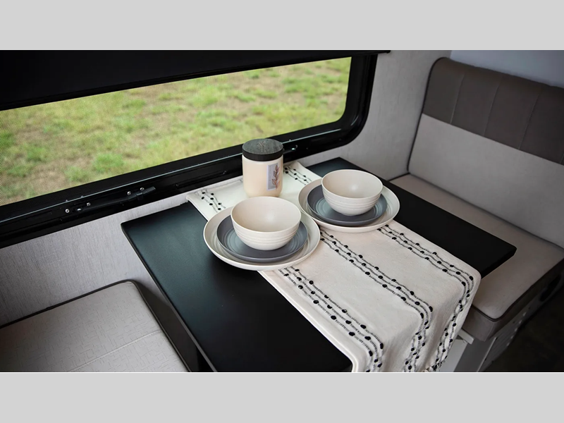 The one-piece Luxe vinyl flooring and aluminum cabinetry will be easy to clean, and there are sleek solid surface countertops. You will also find Tweed interior walls with Azdel, USB charging ports to keep your phone charged, plus an on-demand water heater for added comfort!